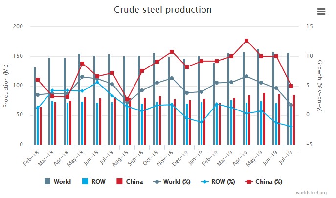 Τόσο η παγκόσμια παραγωγή χάλυβα όσο και, πιο συγκεκριμένα, η παραγωγή χάλυβα της Κίνας για τα χρονικά διαστήματα μεταξύ Φεβρουαρίου-Δεκεμβρίου 2018 και Ιανουαρίου-Ιουλίου 2019 παρουσιάζονται στο παρακάτω γράφημα: