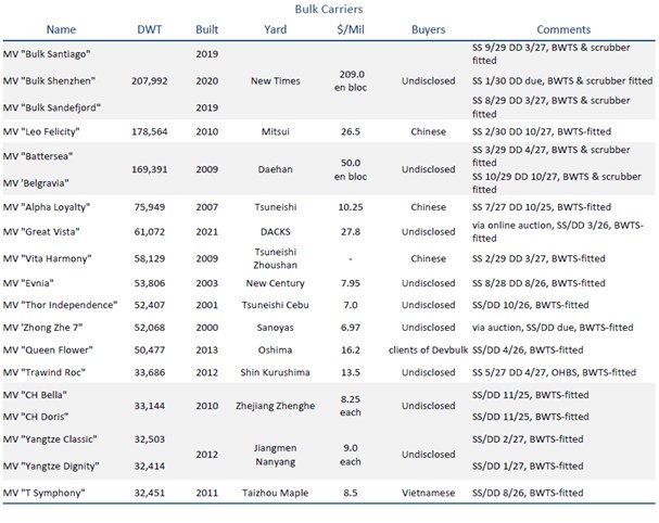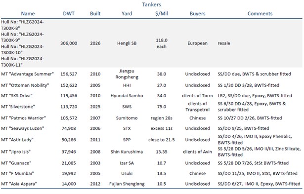 Στο ίδιο μοτίβο κινήθηκε και η second-hand αγορά δεξαμενόπλοιων. Όπως αναφέρει η ίδια έκθεση, η δυναμική των αγοραπωλησιών για τα εν λόγω πλοία παρέμεινε σταθερή την περασμένη εβδομάδα, με το ενδιαφέρον για μεγαλύτερης χωρητικότητας πλοία να βρίσκεται στο επίκεντρο, σύμφωνα με τα στοιχεία της έκθεσης. Συνολικά 15 πλοία άλλαξαν χέρια, με την πώληση τεσσάρων VLCCs να αντικατοπτρίζει την πρόσφατη άνοδο του κλάδου.
