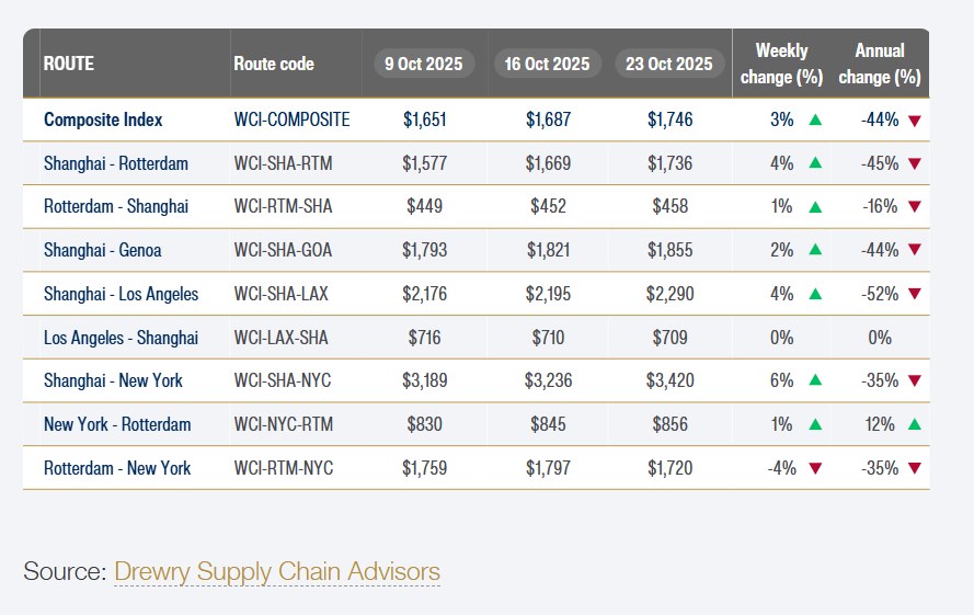 Συγκεκριμένα, ο δείκτης World Container Index (WCI) της Drewry διαμορφώθηκε στα $1.746/FEU την εβδομάδα με πέρας την Πέμπτη 23 Οκτωβρίου, καταγράφοντας άνοδο της τάξης του 3%. Πρόκειται για τη δεύτερη συνεχόμενη εβδομάδα αύξησης των ναύλων, έπειτα από 17 εβδομάδες κατακόρυφης πτώσης. Παρόλα, αυτά ο δείκτης WCI εξακολουθεί να ανέρχεται σε επίπεδα χαμηλότερα κατά 44% σε ετήσια βάση.