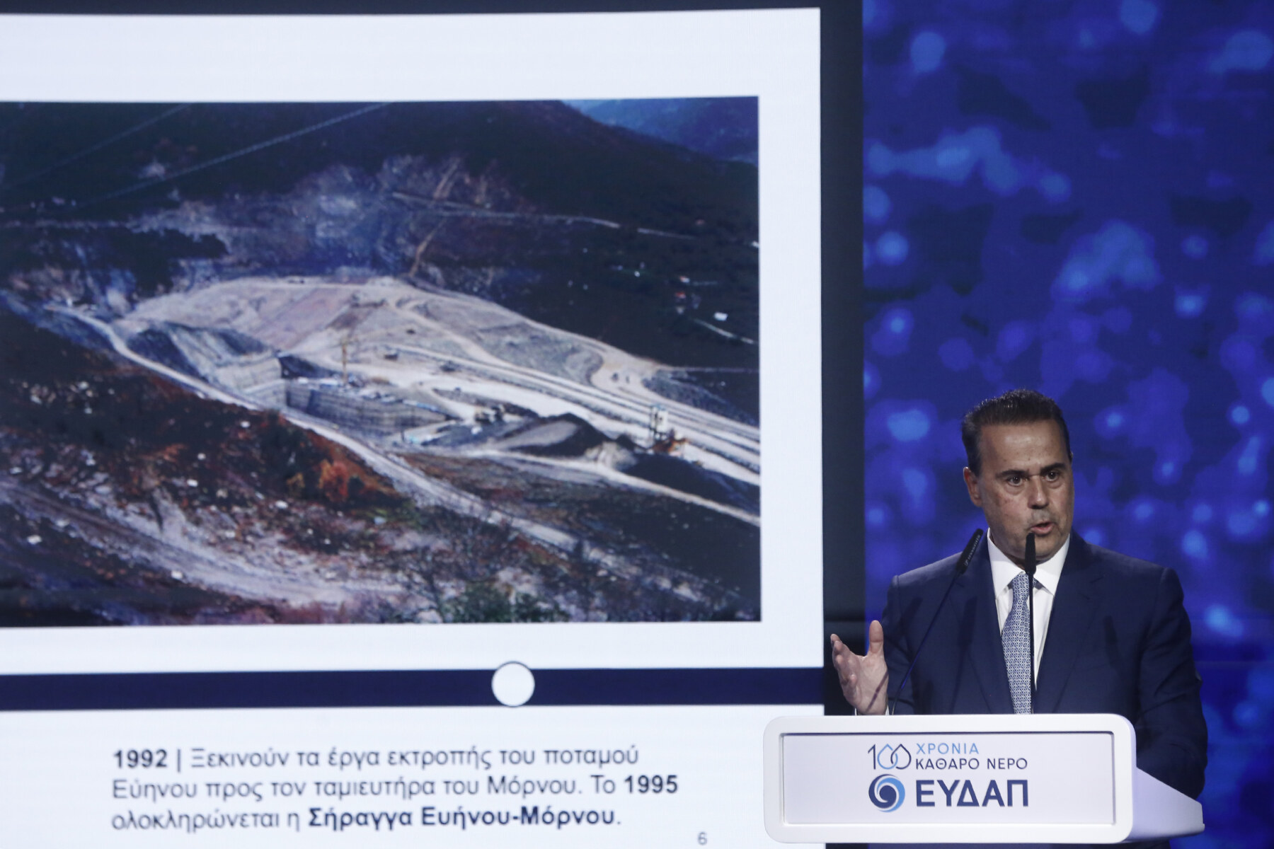 Ο πρόεδρος της ΕΥΔΑΠ, Γιώργος Στεργίου, έκανε μία ιστορική αναδρομή, υπογραμμίζοντας, μεταξύ άλλων, τον ρόλο του Ελ. Βενιζέλου, ο οποίος με τη συνεργασία της Ούλεν, δημιούργησε το πρώτο δίκτυο νερού στην πρωτεύουσα, αλλά και του Κωνσταντίνου Καραμανλή, στις μέρες του οποίου έγινε πράξη η ολοκληρωμένη διαχείριση του νερού από την ΕΥΔΑΠ. Αναφέρθηκε επίσης στη σημαντική συμβολή των πρωθυπουργών Κωνσταντίνου Μητσοτάκη που διαχειρίστηκε με απόλυτη επιτυχία την κρίση της λειψυδρίας στην αρχή της δεκαετίας του 90′, αλλά και του Κώστα Σημίτη. Τέλος, υπογράμμισε τον ρόλο νυν πρωθυπουργού Κυριάκου Μητσοτάκη, αλλά και τη συμβολή του ανθρώπινου δυναμικού της εταιρείας.