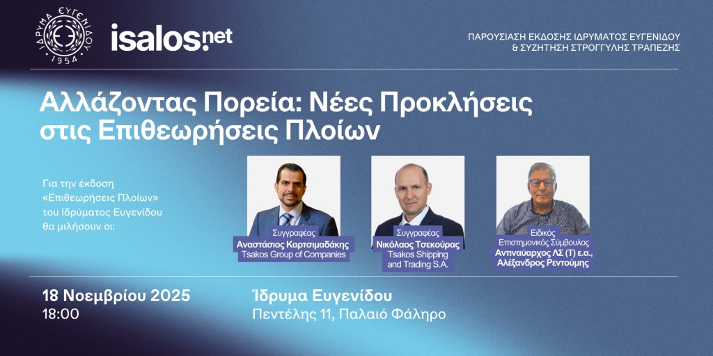 Πιο συγκεκριμένα, την Τρίτη 18 Νοεμβρίου 2025 και ώρα 18:00 στο Αμφιθέατρο του Ιδρύματος Ευγενίδου, θα λάβει χώρα η εκδήλωση με τίτλο «Αλλάζοντας Πορεία: Νέες Προκλήσεις στις Επιθεωρήσεις Πλοίων».