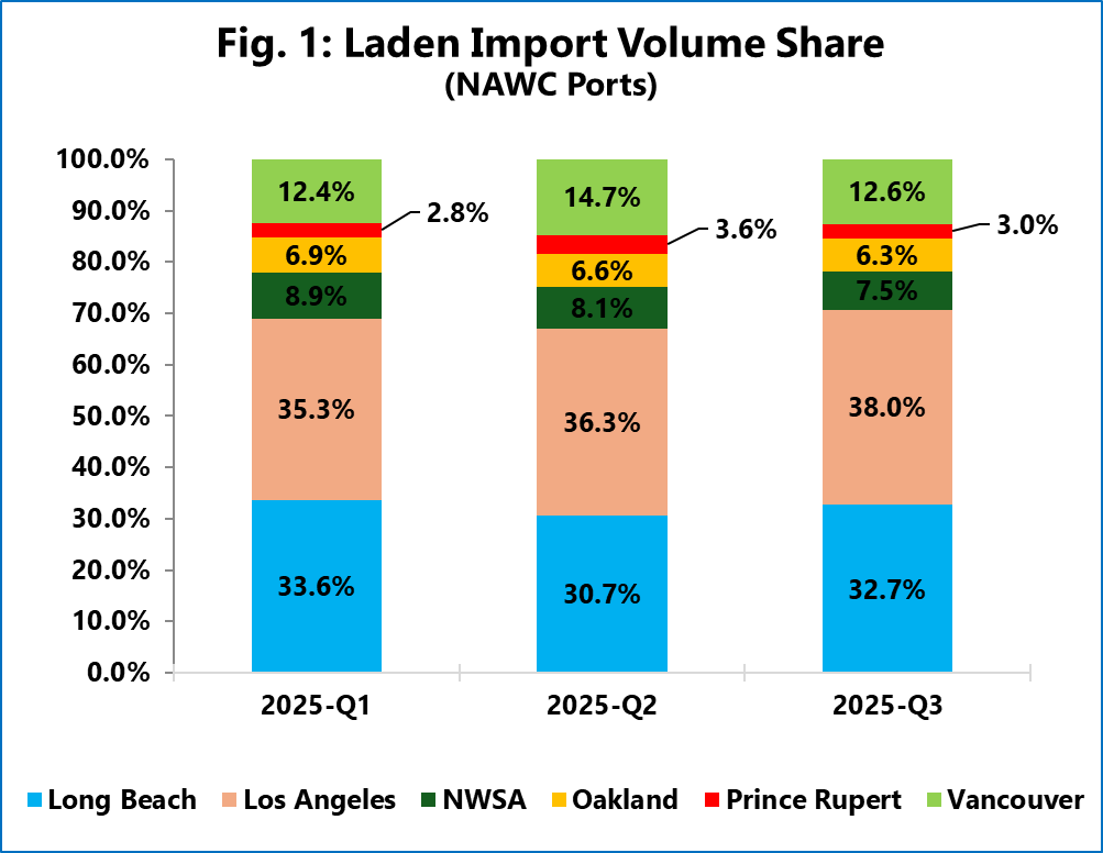 Ειδικότερα, κατά το τρίτο τρίμηνο του 2025, το San Pedro Bay (Λος Άντζελες – Λονγκ Μπιτς) συγκέντρωσε το 70,7% των συνολικών εισαγωγών φορτίων της περιοχής, από 68,9% το πρώτο τρίμηνο, με την άνοδο να οφείλεται εξ ολοκλήρου στο Λος Άντζελες, του οποίου το μερίδιο αυξήθηκε από 35,3% σε 38,0%. Αντίθετα, το Λονγκ Μπιτς υποχώρησε στο 32,7%.