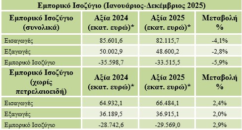 Ως αποτέλεσμα των παραπάνω, το εμπορικό έλλειμμα στο δωδεκάμηνο του 2025 μειώθηκε, κατά -5,9%, στα 33,52 δισ. ευρώ από 35,60 δισ. ευρώ το δωδεκάμηνο του 2024. Χωρίς τα πετρελαιοειδή, το εμπορικό έλλειμμα αυξήθηκε κατά 2,9% και άγγιξε τα 29,57 δισ. ευρώ από 28,74 δισ. ευρώ, δηλαδή αυξήθηκε κατά 826,4 εκ. ευρώ.