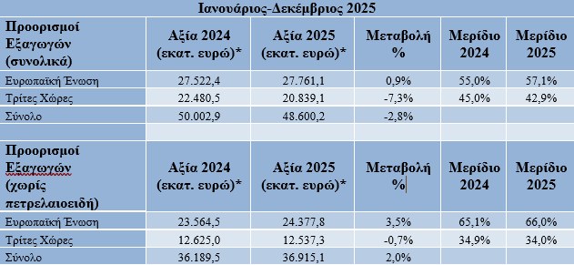 Οι συνολικές εξαγωγές το διάστημα Ιανουαρίου-Δεκεμβρίου 2025 μειώθηκαν κατά -2,8% και άγγιξαν τα 48,60 δισ. ευρώ από 50 δισ. ευρώ, μειώθηκαν δηλαδή κατά 1,40 δισ.€, σε σχέση με την αντίστοιχη περίοδο του 2024.