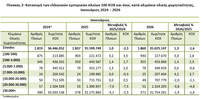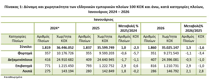 Αντίθετα, σύμφωνα με την ΕΛΣΤΑΤ, η ολική χωρητικότητα του ελληνικού εμπορικού στόλου (πλοία 100 dwt) ανήλθε σε 35.025.147 dwt και παρουσίασε μείωση 1,6% τον Ιανουάριο 2026 σε σύγκριση με την αντίστοιχη χωρητικότητα του Ιανουαρίου 2025, έναντι μείωσης 2,3% που είχε σημειωθεί κατά την αντίστοιχη σύγκριση του Ιανουαρίου 2025 προς τον Ιανουάριο 2024.