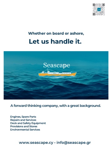 Whether on board or ashore, Let us handle it. p A forward thinking company, with a great background. Engines, Spare Parts Repairs and Services Deck and Safety Equipment Provisions and Stores Environmental Services www.seascape.cy • info@seascape.gr