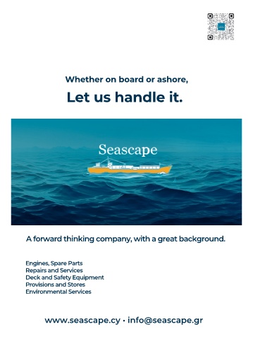 Whether on board or ashore, Let us handle it. p A forward thinking company, with a great background. Engines, Spare Parts Repairs and Services Deck and Safety Equipment Provisions and Stores Environmental Services www.seascape.cy • info@seascape.gr